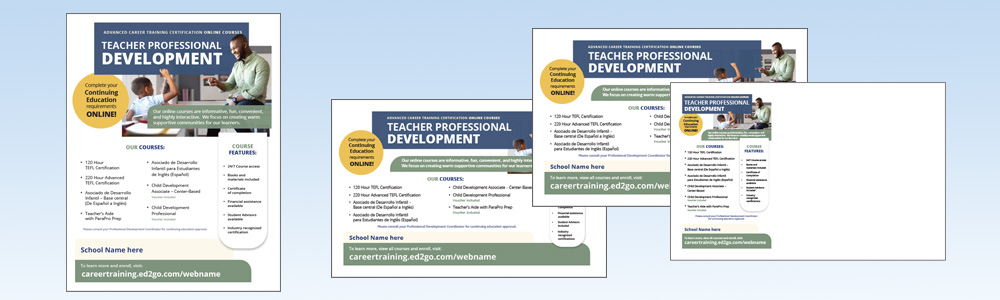 Use this flyer, print ad, and mailer to promote Teacher Professional Development Continuing Education Online Courses.