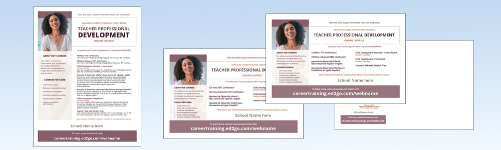 Use this flyer, print ad, and mailer to promote Teacher Professional Development Continuing Education Online Courses.