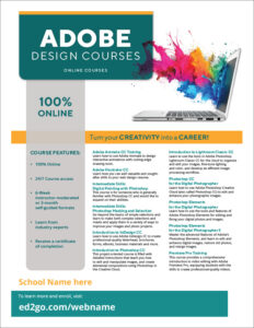 Many pieces were designed as editable PDFs, so that you can easily use the free version of Adobe Acrobat to customize your contact information. Simply find the flyer that you want to use, download, open in Acrobat, enter your institutions name and ed2go hosted website address into the editable fields, then click the red flatten and save button in the top right corner.